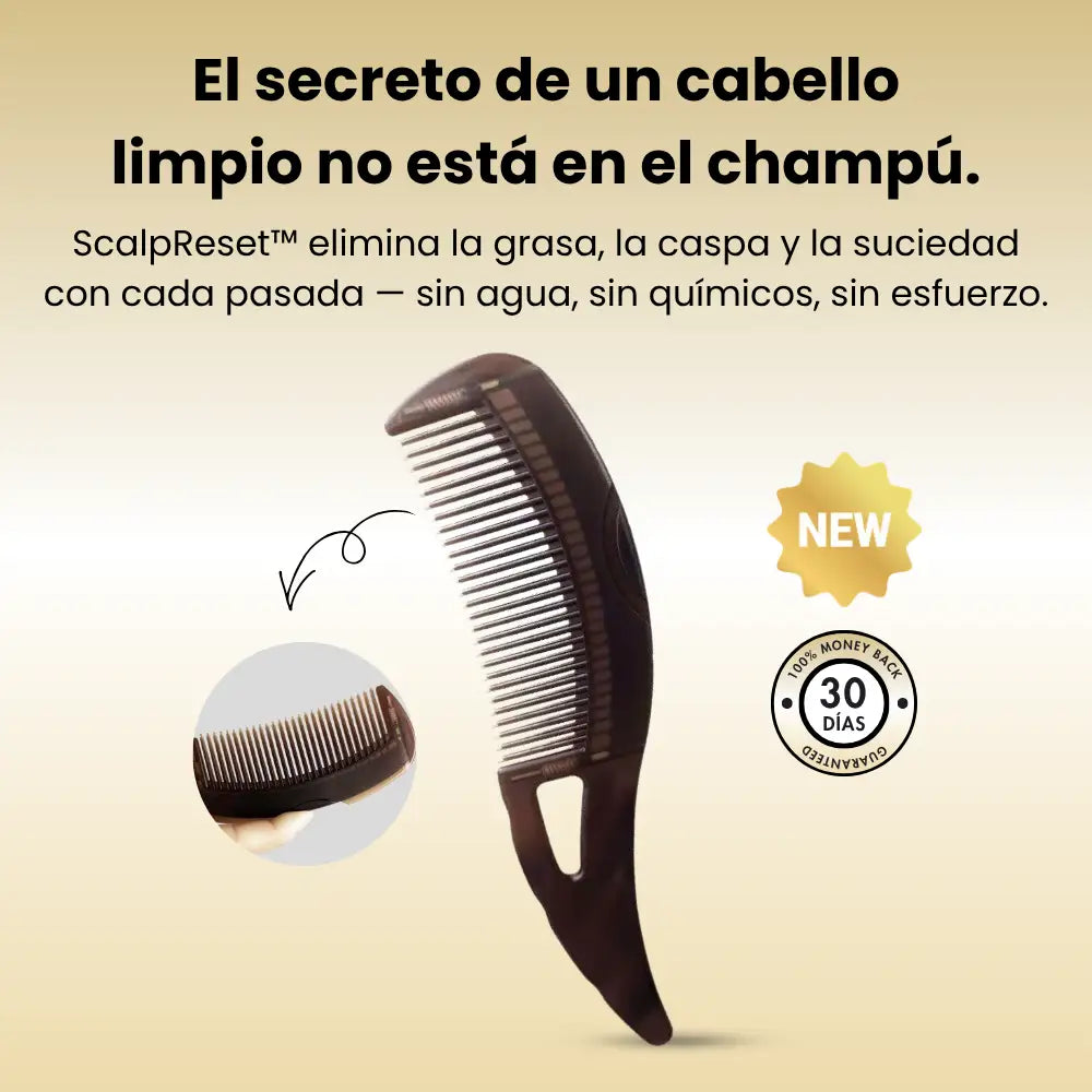 El único peine que elimina el exceso de grasa, caspa y suciedad del cuero cabelludo — sin una sola gota de agua.
