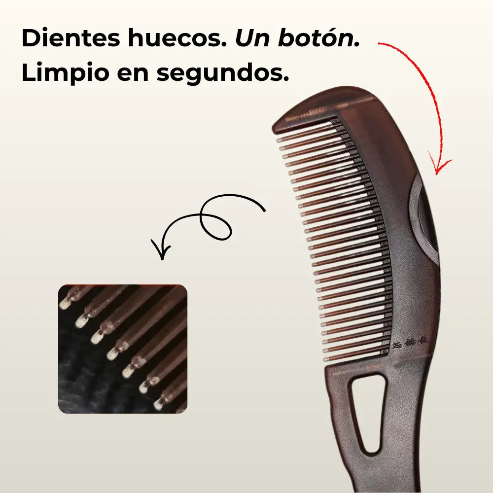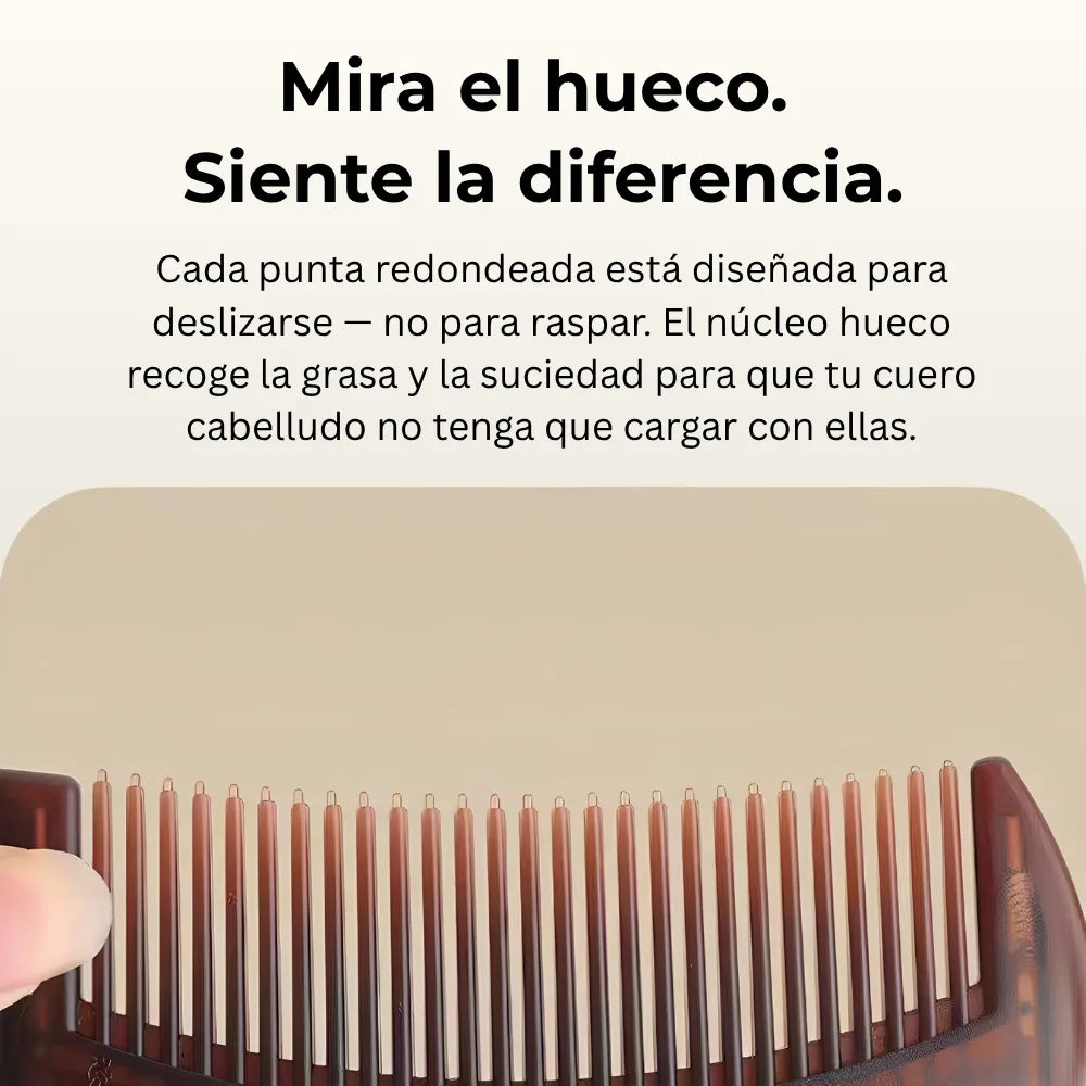 Cada diente es hueco por dentro. Al peinar, la acción capilar succiona el exceso de grasa, caspa y suciedad directamente a la cámara interior del diente — dejando las raíces instantáneamente más limpias.
